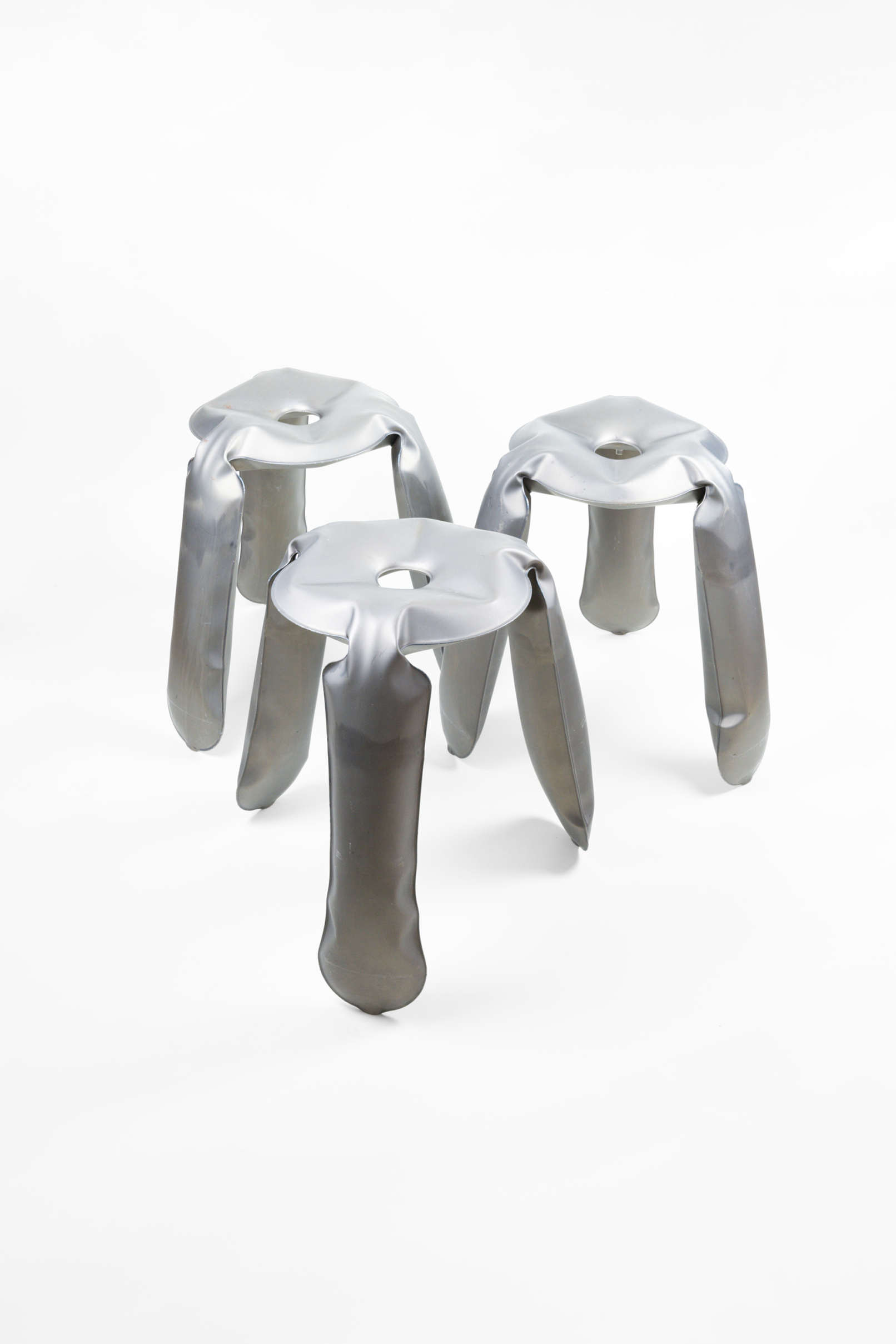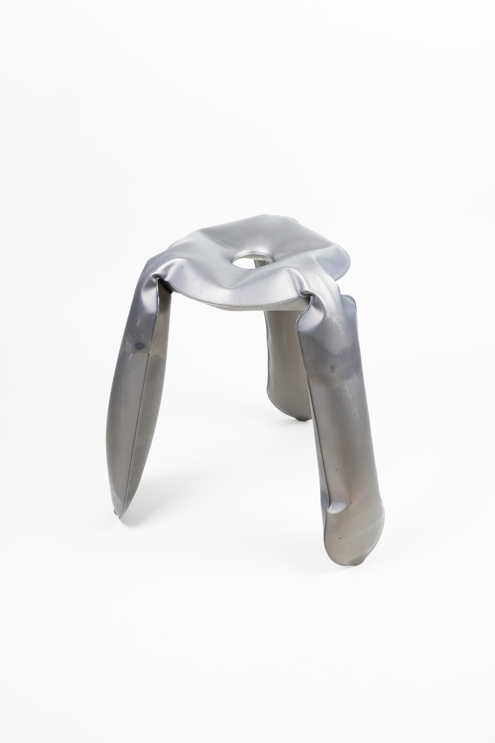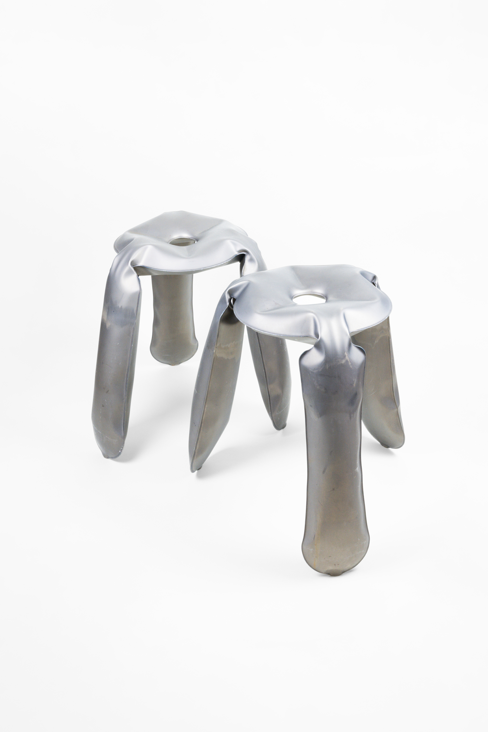 Steel Plopp stools by Polish designer Oskar Zieta. The unique form is obtained by welding steel sheets together and inflating with high pressure. Early edition ca. 2008 with raw finish.